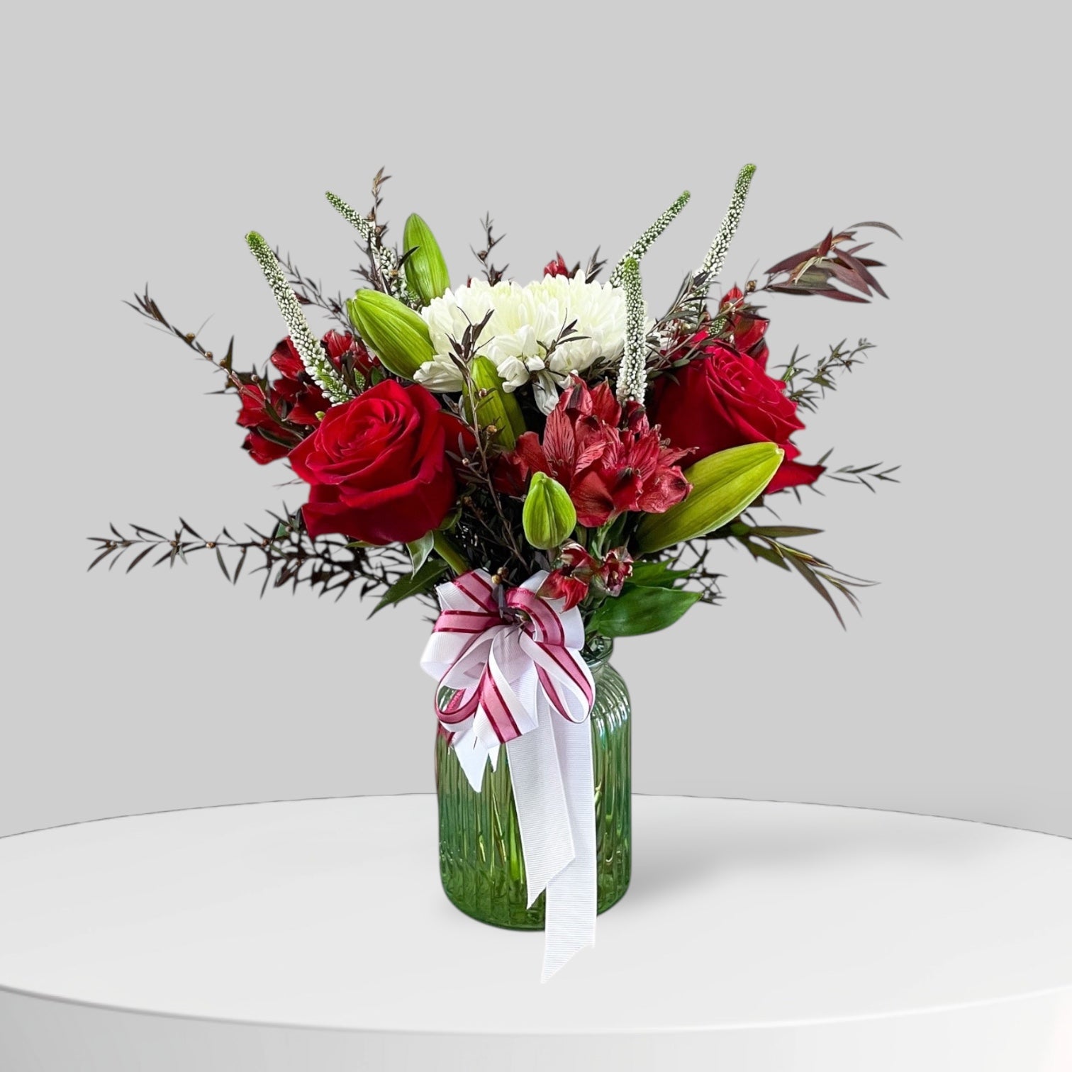 This expertly arranged Christmas vase is bursting with festive colors and fresh flowers, adding a touch of holiday cheer to any room. Perfect for bringing the holiday spirit to your home or as a thoughtful gift for loved ones. Brighten up your holiday season with this stunning Festive arrangement.