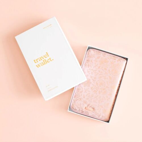 Rose gold metal YKK zipper and hardware. Blush vegan leather outer and lining. Packaged in a beautiful keepsake gift box with rose gold foil accents and velvet finish.